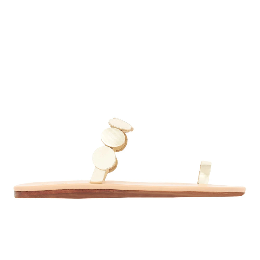 The bestselling Discs collection takes another turn in the spotlight – we've refreshed this style with our new thin flip sole. The Calisto features mirror-leather discs in a toe-ring slide shape to create an eye-catching sandal that will take you out on the town – but in comfort. Which colour draws your eye?