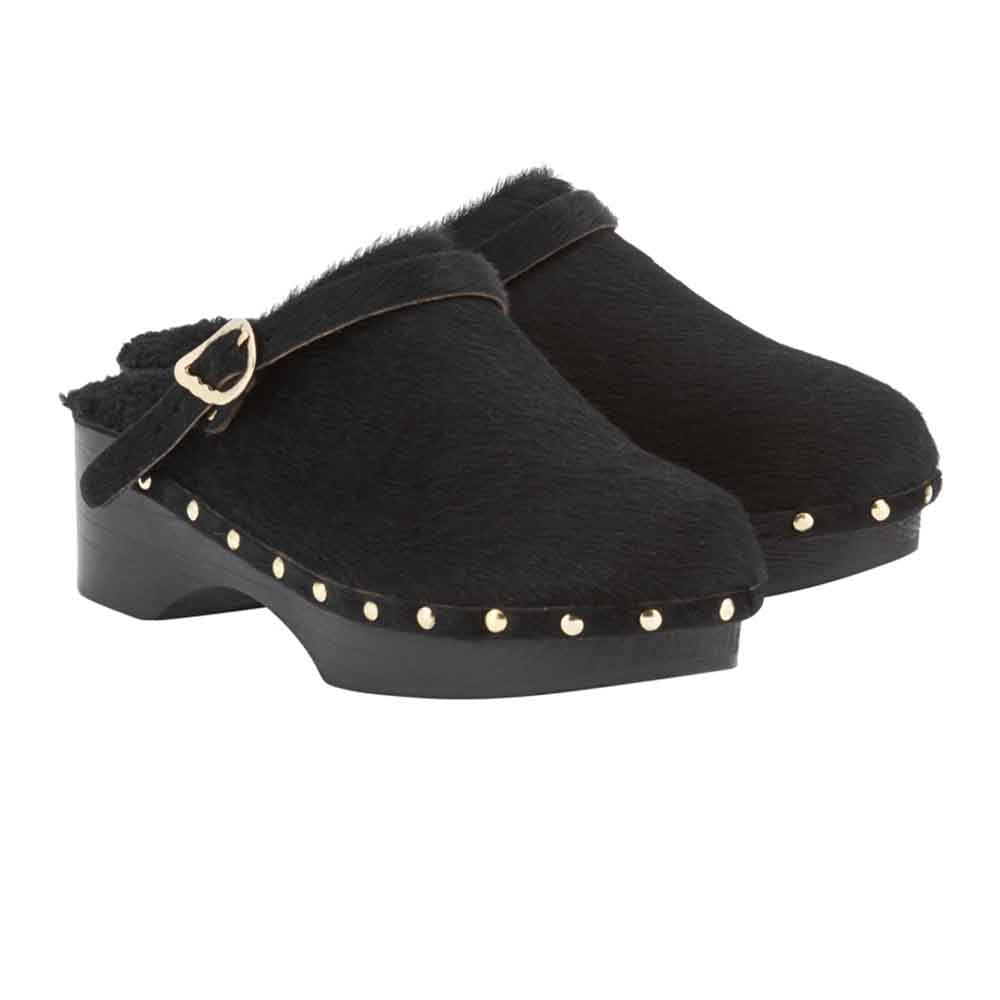 Our iconic clogs are making a comeback. The Classic Closed Clog is simple and effective, with its low platform, enclosed toe and detail strap with signature buckle. All our clogs feature a lightweight wooden sole, soft padded insole and anti-slip rubber grip for a comfortable, wearable clog. This version is crafted in pony hair and finished with studs – just choose your animal print, or opt for a chic plain black.