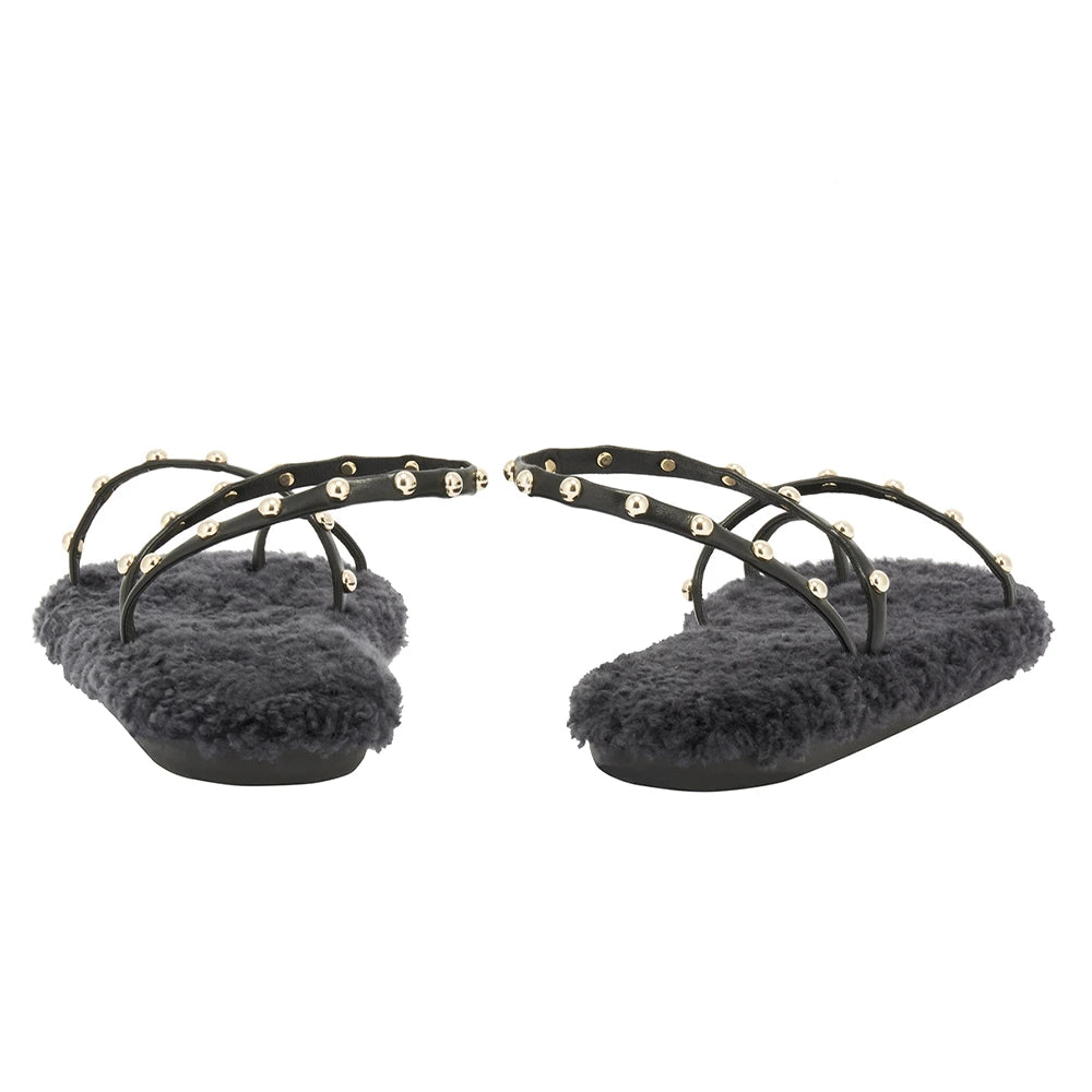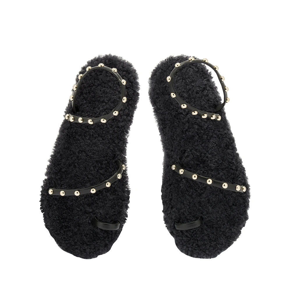 The barely-there Eleftheria sandal has a new trick: a sheepskin-lined cushioned insole. There’s a playful contrast between the studded nappa leather straps and the luxurious texture of the sheepskin, creating a head-turning style that’s a seasonal must. We love this style with a floor-sweeping dress for entertaining at home.