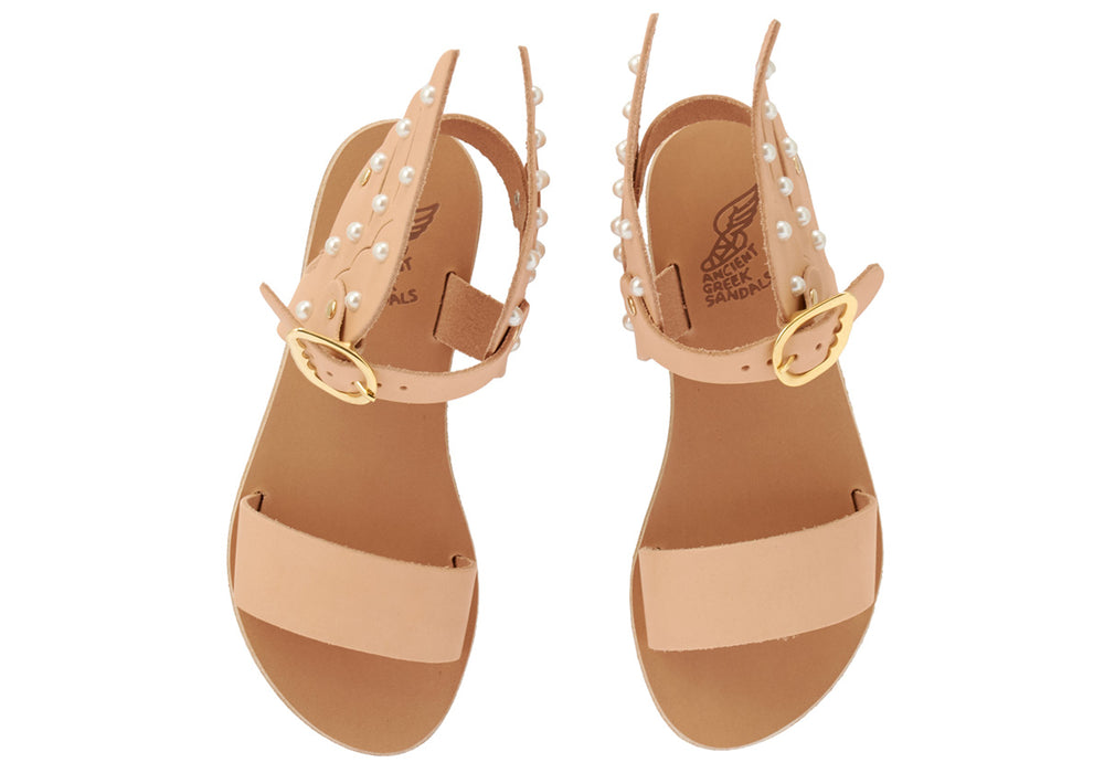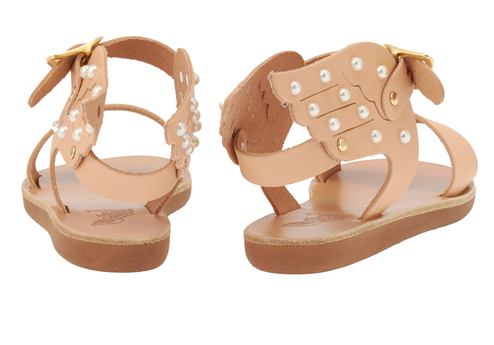 You won’t see this style anywhere else. The winged heel strap will make all onlookers want to fly to the nearest Ancient Greek Sandal store and make their first or their tenth purchase! With the added luster portrayed by the subtle yet brilliant pearls, this is the perfect sandals for our little friends to make a statement.