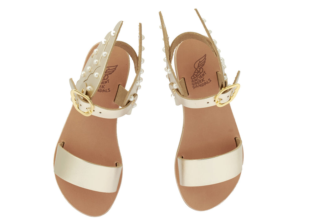 You won’t see this style anywhere else. The winged heel strap will make all onlookers want to fly to the nearest Ancient Greek Sandal store and make their first or their tenth purchase! With the added luster portrayed by the subtle yet brilliant pearls, this is the perfect sandals for our little friends to make a statement.