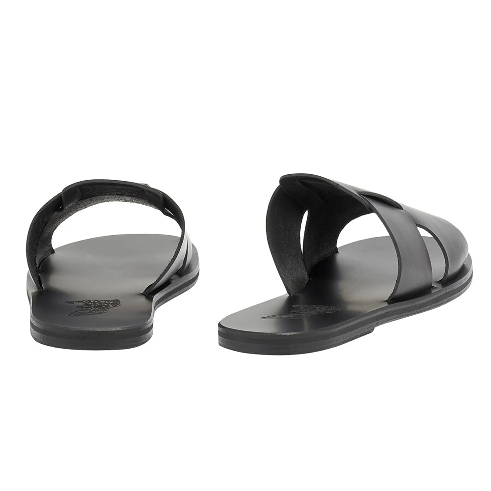 Slip into Miltiadis. A wide band of leather is shaped and cut to accommodate a bisecting second band of black leather, which weaves through to create a simple, architectural design. The streamlined sole keeps the silhouette light. A versatile and timeless style.