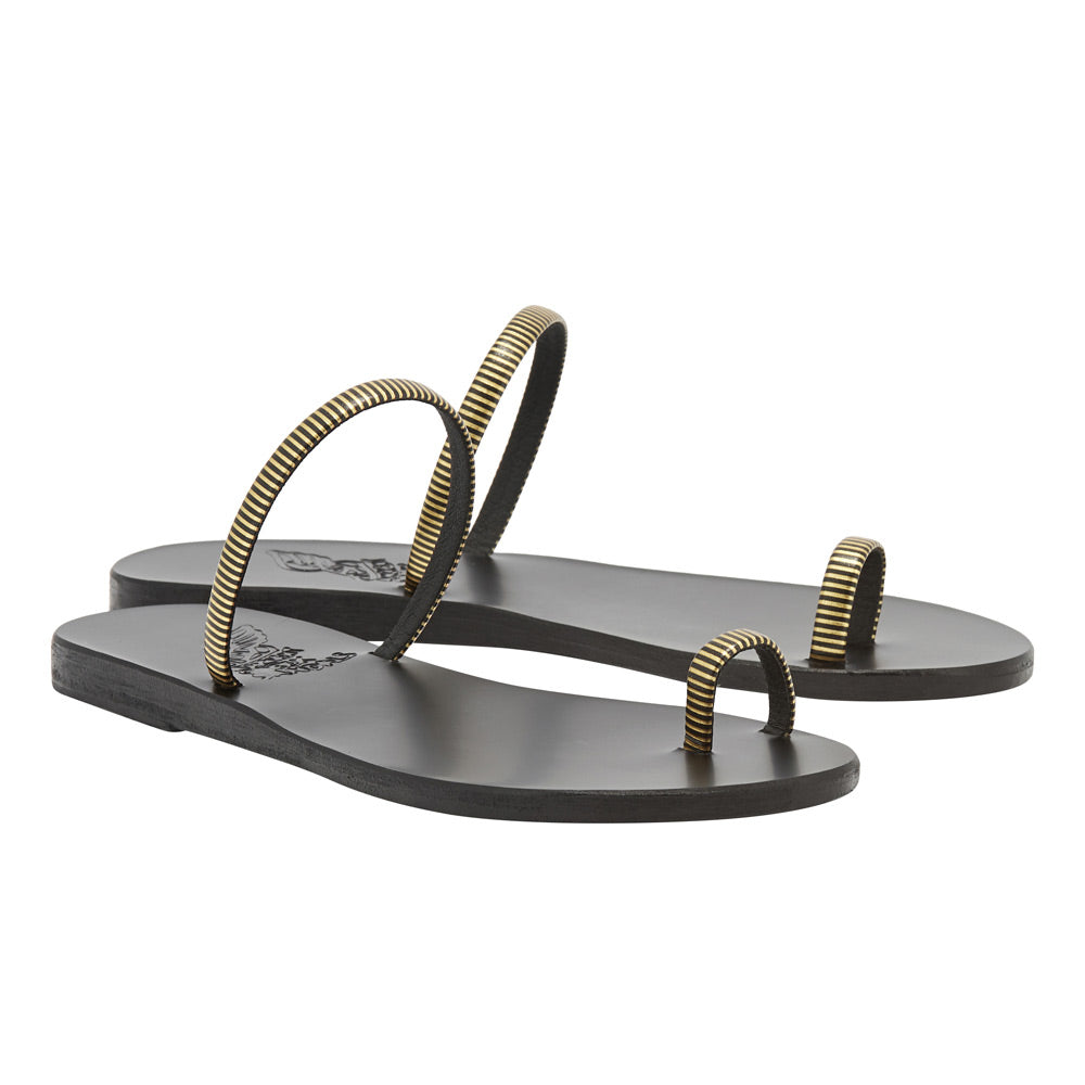 Meet your new favourite evening sandal. Nora comprises a simple strap across the foot and one encircling the big toe. The sandal is crafted in faux leather and printed with a gold stripe for a luxurious but playful look. This is a sandal that wants to be shown a good time, so wear with your favourite evening pieces and prepare to dance.