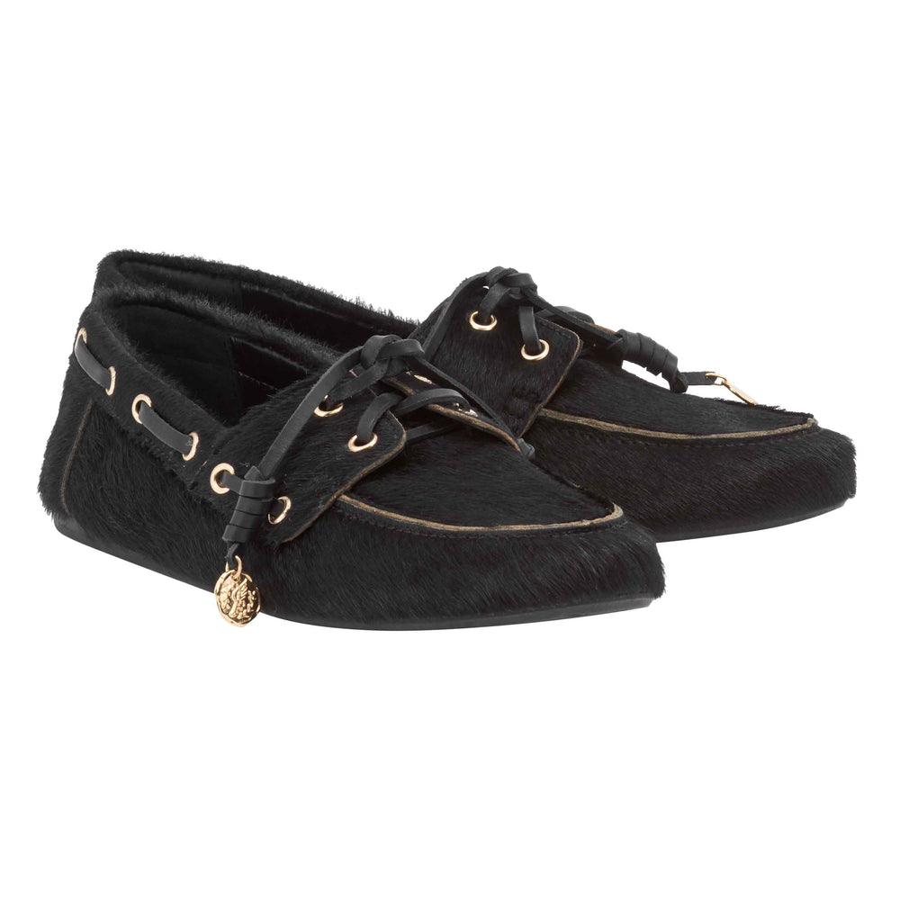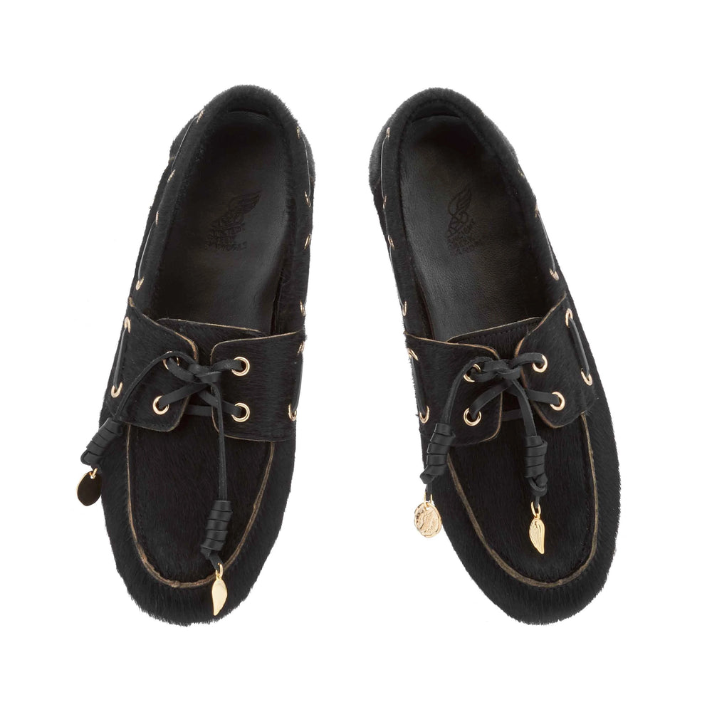 Named after the Greek word for boat, Pliaria takes the traditional preppy style and gives it a laid-back – but highly desirable – feel. Handmade in Greece to a typical boat-shoe shape, the style is given a twist with a pony-hair fabrication and distinctive leather laces rolled to form a special knot (inspired by the father of our creative director, Christina Martini), and finished with gold charms hanging from the laces. Choose a patterned pair – Cow, Lynx or Bambi – or opt for plain black. Already a must-have style, Pliaria adds insouciance to dresses or tailoring, or pairs beautifully with weekend favourites.