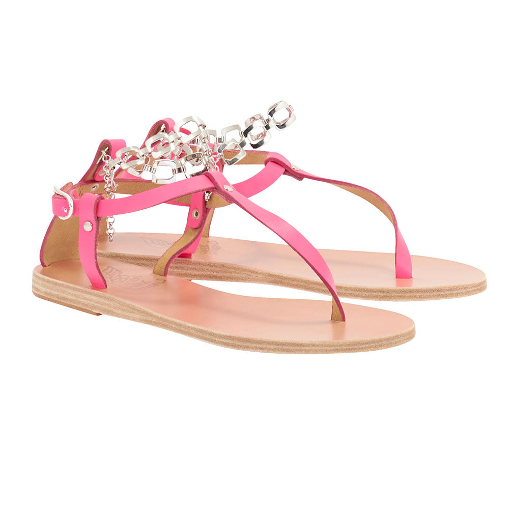 Our Promitheas sandal is decorated with the silver sixties inspired square chain bracelet wrapping around the ankle and paired with leather t-strap. Available in black, pink florescent and yellow florescent leather.