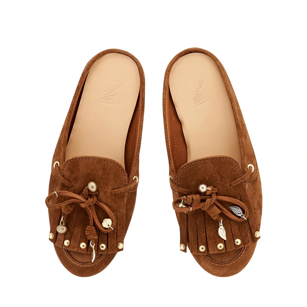 Rota is a backless slip-on style that brings classic elements of our boat shoe and moccasin styles out to play. Crafted in soft suede and given personality with charms, fringing and knotted laces. These will be a go-to shoe for summer and into autumn.