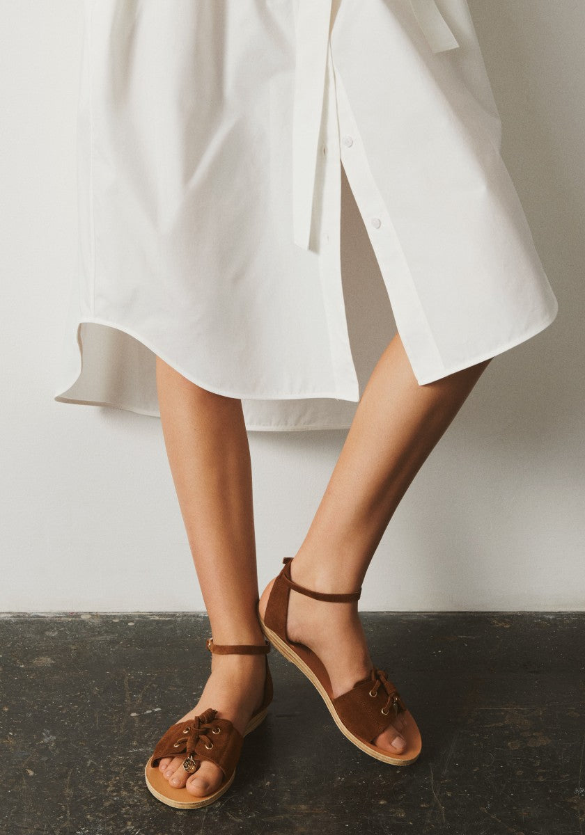 Sentina is one of our ‘boat shoe sandal’ styles, taking its cues from Pliaria, our modern twist on the boat shoe. Sentina echoes the boat shoe detailing, with signature lacing, leather knots and tiny leather charms. Sentina is a more structured ankle strap sandal set on our classic leather sole and crafted in soft crosta suede. Choose your shade.