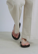 This Saionara is a simple flip-flop sandal taken in a new direction: with its jelly thong upper it recalls the ultimate in summer sandals, and with its contrasting sheepskin insole it suggests cosier moments. The contrast is the thing – wear to run errands, to entertain at home, or to make a statement on evenings out. A head-turner.