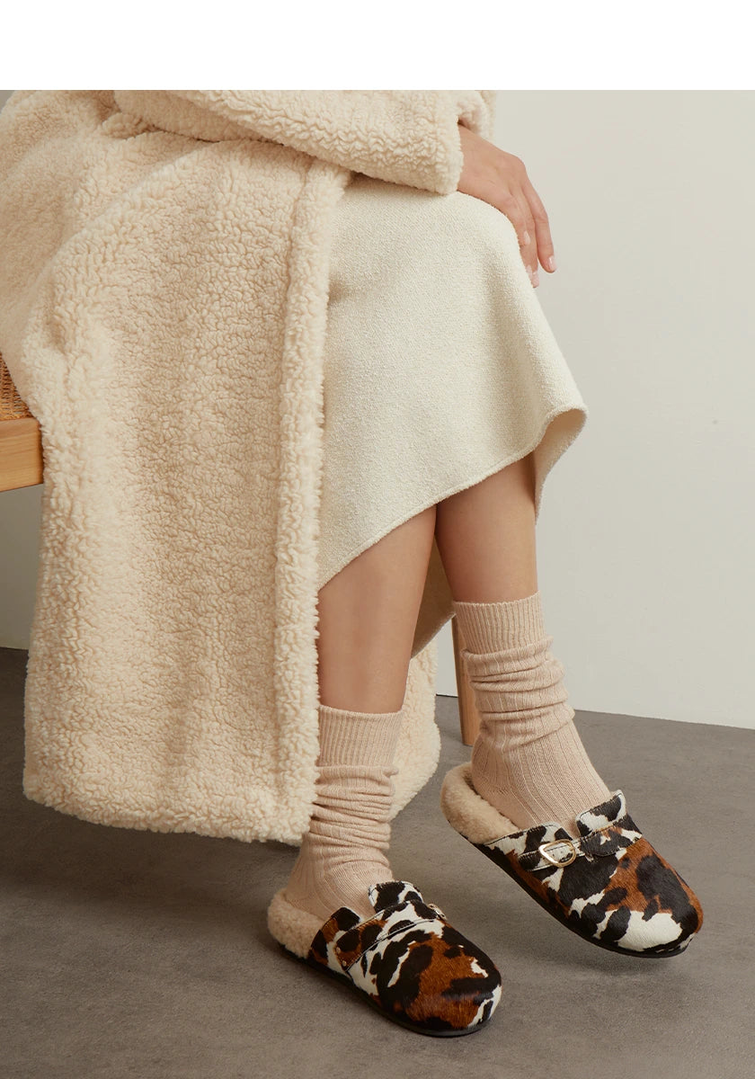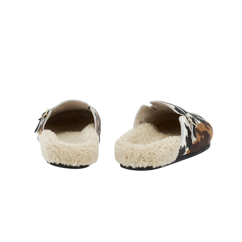 Meet Vasilitsa – robust enough to take you around town, comfortable enough to make you wonder if you really need to leave home at all. The cocooning footbed is lined in sheepskin, and the rounded closed toe is crafted in pony hair and finished with an accent strap and signature wing-shape buckle. Choose from sophisticated black or statement cow print.