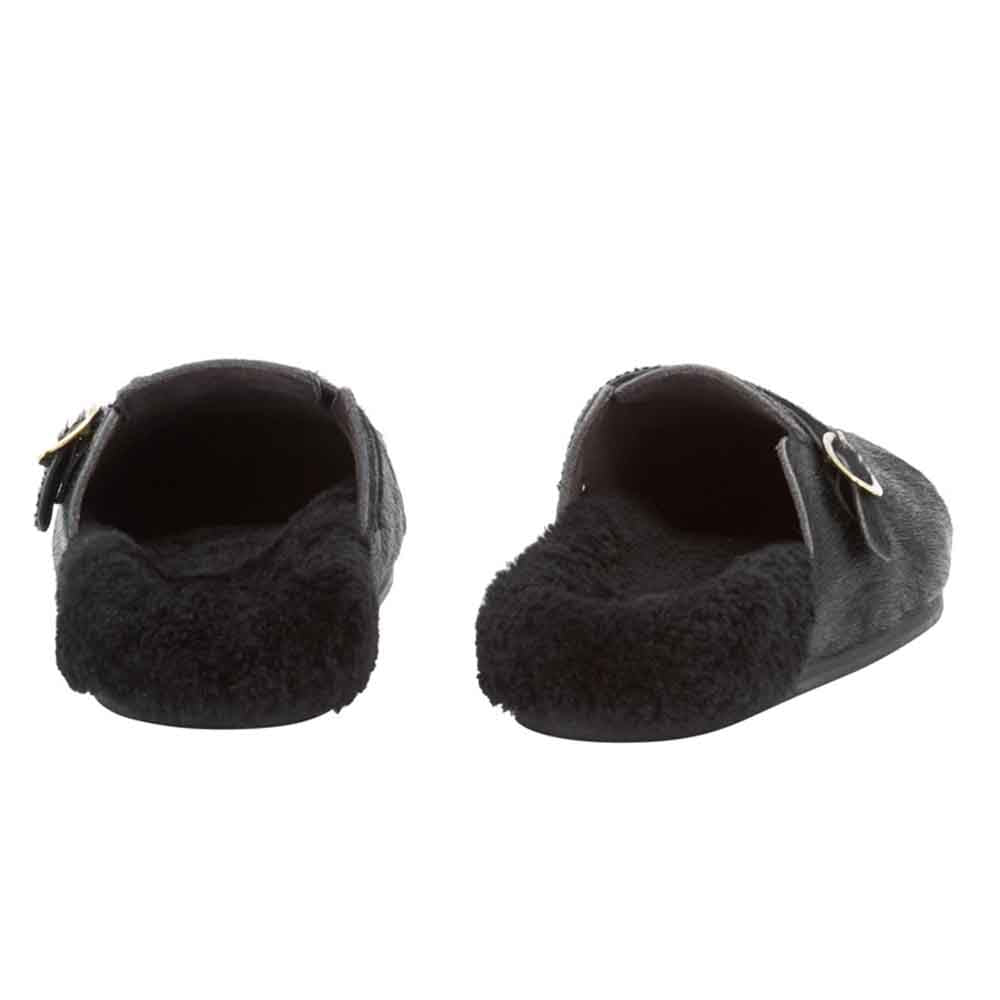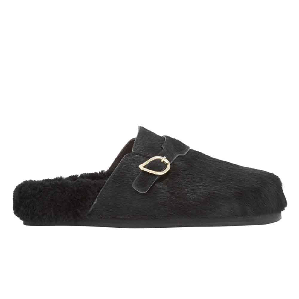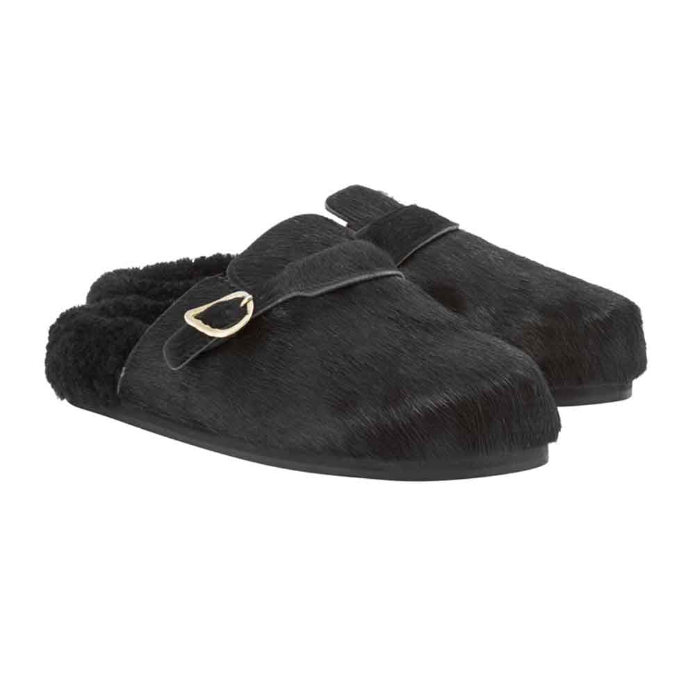 Meet Vasilitsa – robust enough to take you around town, comfortable enough to make you wonder if you really need to leave home at all. The cocooning footbed is lined in sheepskin, and the rounded closed toe is finished with an accent strap and signature wing-shape buckle. In a choice of animal-print pony hair fabrications, this version is made to stand out.