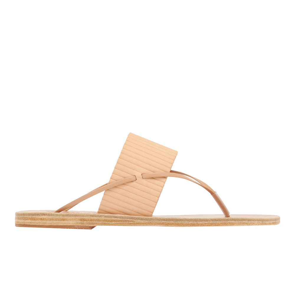 The Yni sandal consists of a wide strap thong with hot-stamped geometric stripes embedded onto the leather and is inspired by traditional Greek household tools.
